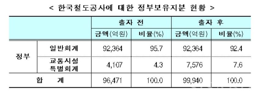 정부는 코레일에 대해서도 총액 3469억원 규모의 현물출자를 완료했다. 출자재산은 고속철도차량 22편성(220량)이다. 코레일에 대한 정부 총 출자액은 9조6471억원에서 9조9940억원으로 증가했다.