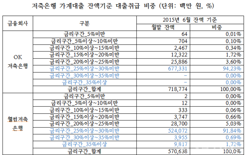 6월 기준 두 저축은행의 전체 가계신용대출 잔액 1조2894억원 중 연 금리 25% 이상의 대출 잔액이 94%(1조2151억원)에 달했다.