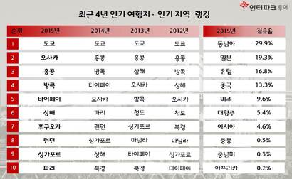 오사카가 홍콩을 누른 점도 눈에 띤다. 오사카는 6.1% 점유율을 기록하며 홍콩을 3위로 밀어냈다. 후쿠오카도 3.3% 점유율로 7위를 차지해 일본 여행 열풍에 힘을 보탰다. 오사카와 후쿠오카는 지난해 대비 2배 이상 여행객이 늘어난 것으로 나타났다.
