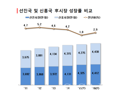 성장률은 각국 사정에 따라 갈렸다. 미국 시장은 금리 인상으로 증가세가 둔화해 올해 보다 1.6% 성장한 1775만대가 판매될 것으로 전망됐다. 유럽은 더딘 경기 회복과 잇따른 테러로 회복세가 위축, 내년 3.1% 늘어난 1628만대 판매될 것으로 예측됐다.