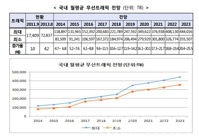 이는 정부 예상도 넘은 수준이다. 미래부가 2013년 발표한 ‘모바일 광개토 플랜 2.0’에선 2015년 월평균 트래픽 양을 13만 1965TB로 봤다. 이 수치가 무선 데이터 트래픽에 와이브로 사용량을 합친 것을 감안하면 예측과 실제 간 차이는 더 커진다.