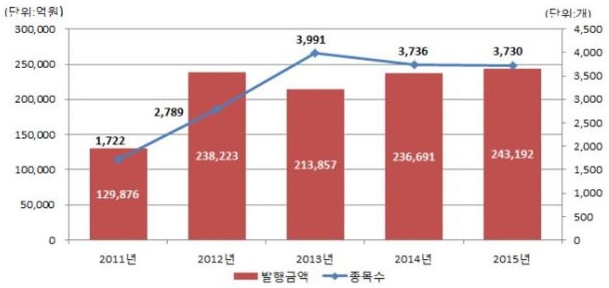 모집형태별로는 공모발행이 전체 발행금액의 21.7%(5조2686억원), 사모발행이 78.3%(19조506억원)를 나타냈다. 공모발행은 전년대비 11.0% 증가율을 보였고, 사모발행은 0.7% 증가율로 미미한 수준에 그쳤다.