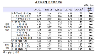 한은 금융통계팀이 발표한 2015년 12월중 금융기관 가중평균금리에 따르면 지난해 12월 시중은행 가계대출 금리는 3.23%(신규취급액기준)로 전월보다 0.07%포인트 올랐다.