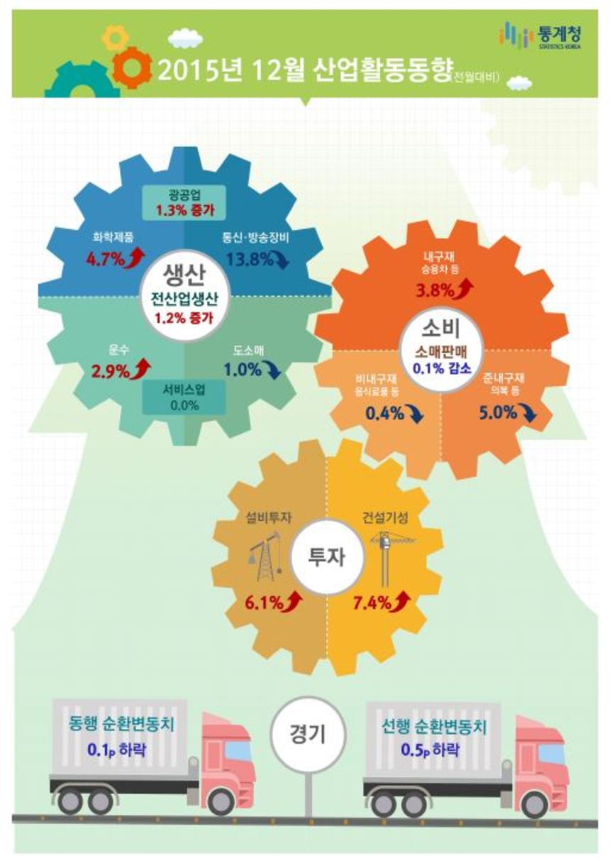 통계청이 29일 발표한 2015년 12월 및 연간 산업활동동향에 따르면, 지난해 전산업생산은 2014년보다 1.5% 증가했다. 광공업생산은 반도체와 석유정제 등에서 증가했지만 전자제품과 기타운송장비 등이 줄어 전년대비 0.6% 감소했다.
