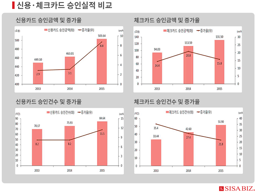 신용카드와 체크카드의 승인실적을 비교해 보면 2015년 신용카드 승인금액은 503조6400억원으로 전년대비 8.8%, 체크카드 승인금액은 131조5000억원으로 15.8% 증가했다. 이에 따라 체크카드 승인금액이 전체 카드에서 차지하는 비중은 2015년 20.6%로 처음으로 20%를 넘어섰다.
