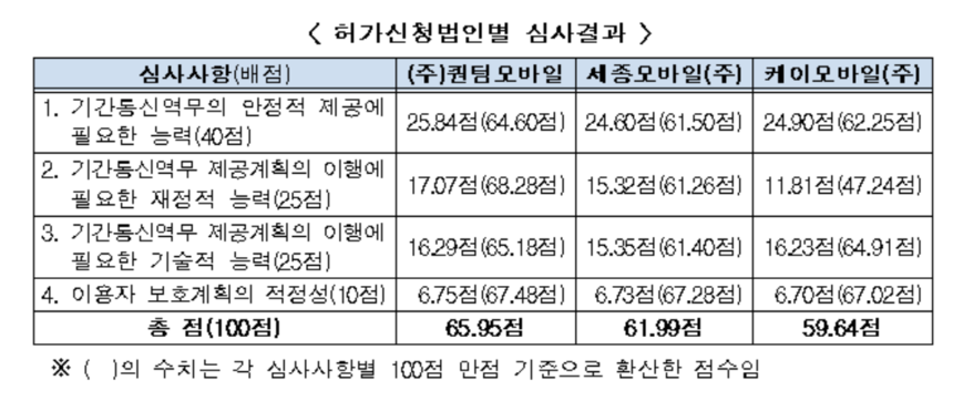 심사결과 퀀텀 모바일은 65.95, 세종모바일은 61.99, K모바일은 59.64점을 받았다. 특히 세 신청 사업자 모두 재정적 측면에서 기간 통신사업을 운영하기 어려운 것으로 나타났다.