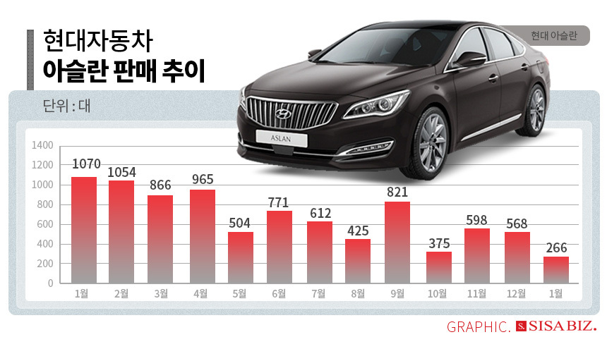지난달 아슬란 판매량은 266대다. 전년 동월대비 75.1%, 전월 대비로는 53.2% 급락했다. 지난해 단종설이 불거졌던 10월 판매량은 375대였다.