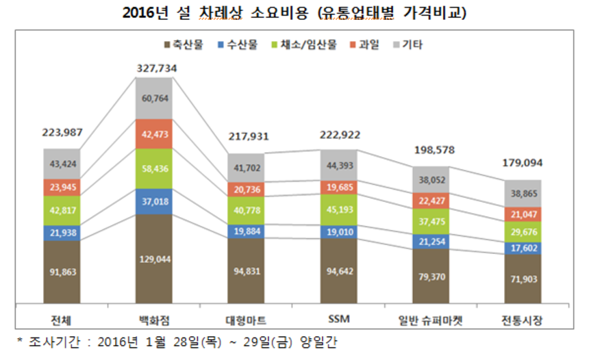 설 차례상 소요 비용은 전통시장과 대형마트, 백화점 등 유통채널 별로 차이가 컸다. 24가지 제수용품을 전통시장에선 평균 17만9094원에 구입할 수 있는 반면 백화점은 32만7734원이었다. 일반 슈퍼마켓은 19만8578원, 대형마트 21만7931원, SSM 22만2922원으로 나타났다.