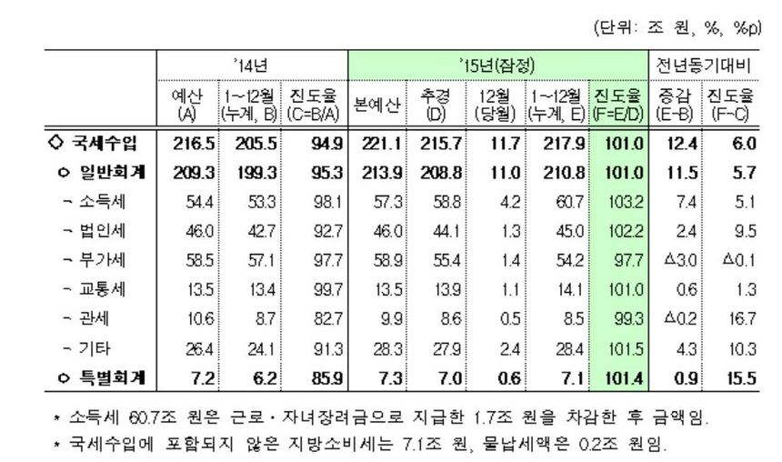 주요 세목별로는 소득세가 부동산거래량 및 취업자 수 증가 등으로 7조4000억원, 법인세가 법인 신고실적 개선 및 비과세·감면 정비 등으로 2조4000억원 증가했다.