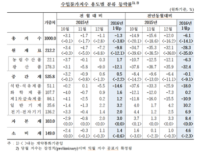 수입물가지수 하락은 국제유가 급락이 주요 원인이었다. 지난 1월 두바이유 가격은 배럴당 26.86달러로 지난해 12월(34.92달러)에 비해 23.1% 떨어졌다.