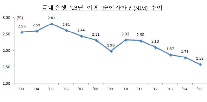2015년 국내은행의 총자산순이익률(ROA)은 0.16%, 자기자본순이익률(ROE)은 2.14%를 기록했다. 2014년보다 ROA는 0.15%포인트, ROE는 1.91%포인트 하락했고 2000년 이후 가장 낮은 수준이다.