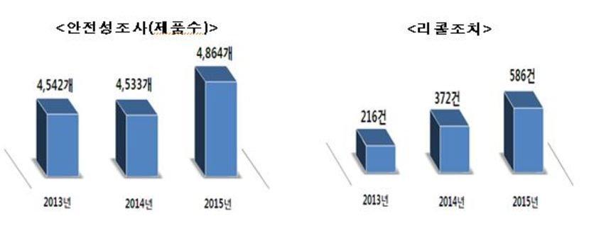 리콜조치는 2013년 216건, 2014년 372건, 2015년 586건으로 매년 증가하는 추세다. 국표원 관계자는 “조사품목 확대 등으로 리콜 처분이 증가했지만 처분을 받고도 이행하지 않는 기업이 발생해 이번 강화대책을 마련했다”고 밝혔다.