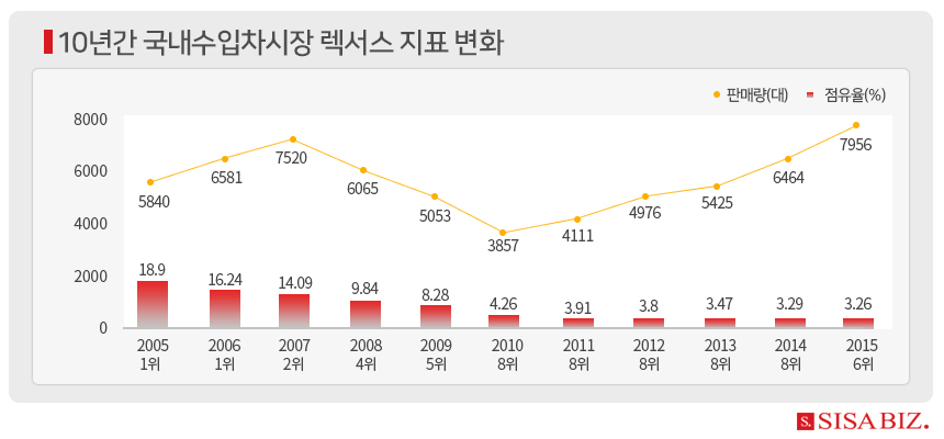 2005년 BMW를 밀어내고 수입차 시장 1위에 올랐던 렉서스는 2006년부터 하락세를 거듭했다. 2010년부터 2014년까지는 BMW 소형차 브랜드 미니(MINI)와 모기업인 도요타 보다 판매량이 떨어졌다.