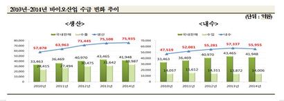 산업통상자원부가 28일 발표한 ‘2014년 기준 국내 바이오산업 실태조사’ 결과에 따르면 2014년 국내 바이오산업 생산규모는 7조5935억원으로 2013년 7조5108억원에 비해 1.1% 성장했다. 내수시장 규모는 5조5955억원으로 전년도 5조7337억원에 비해 2.4% 감소했다.