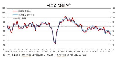 29일 한국은행에 따르면 2월 국내 제조업 기업경기실사지수(BSI)는 전달보다 2포인트 떨어진 63을 기록했다.