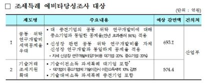 신설이 요구되는 조세특례 제도는 대·중견기업의 공동·위탁 연구개발비에 대해 중소기업과 동일한 공제율(전년 초과분의 50%)을 적용하는 내용 등을 담안 공동·위탁 연구개발비 세액공제율 우대가 대상이다. 예상 감면액은 693억1000만원이다. 대기업이 중소기업에 기술을 이전할 경우 이전소득세액 10%를 감면하는 기술거래조세지원 확대(574억4000만원 감면)도 예비타당성조사 대상에 포함됐다.