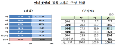 지난해 말 인터넷뱅킹 등록고객은 남성이 53% 여성이 47%로 나타났다. 연령별로는 30대(28.1%), 40대(25%)가 전체의 절반을 상회했다.