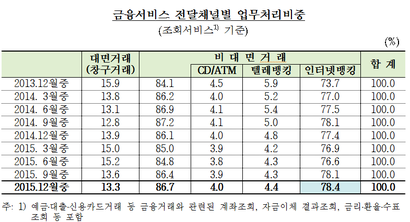 지난해 말 입출금·자금이체시 비대면 거래 비중이 88.7%를 차지했다. 그중 인터넷뱅킹 사용비중(39.4%)은 2009년말 이후 처음으로 CD/ATM 사용비중(37.7%)을 넘어섰다.