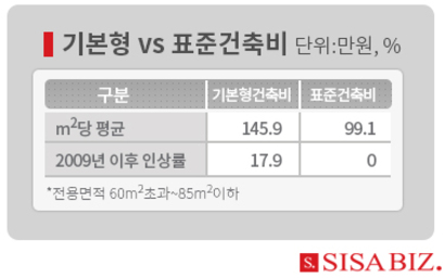 실제 기본형 건축비는 2009년부터 지난해까지 18%나 올랐다. 반면 표준형 건축비 인상률은 0%다. 현재 표준건축비는 기본형 건축비의 67.5%에 불과하다.