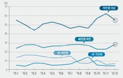 박 교수는 경기 둔화와 단말기유통구조개선법(단통법)을 이러한 변화가 생긴 요인으로 분석했다. 우선 월평균 소득 증가율이 2009년 경제위기 이후 가장 낮은 수치를 보이고 있다. 가계부채는 1200조원을 넘어섰다. 때문에 소비가 위축된 상태다.