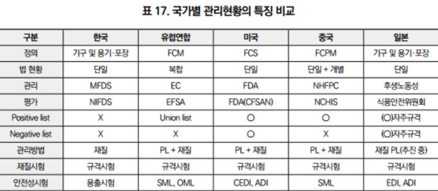 해외 여러 나라들과 비교해 합성수지에 대한 국내 규제는 매우 미흡하다. 유럽연합(EU)은 식품접촉물질 중 합성수지에 대한 단일 규정을 두고 있다. 회원국들은 유럽연합 규정에 근거해 합성수지 원료물질들을 관리한다.