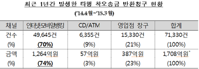 지난해 5월 금감원에 접수된 착오송금 관련 민원은 2013년 141건에서 2014년 175건으로 꾸준히 증가했다. 2014년 4월~2015년 3월중 송금인이 타행에 착오송금한 금액의 반환을 은행에 청구한 규모는 1708억원이다.