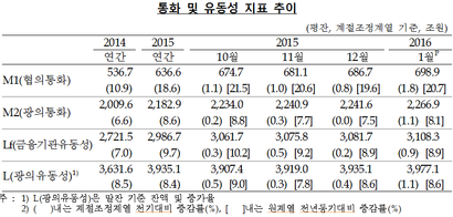한국은행이 9일 발표한 2016년 1월중 통화 및 유동성을 보면 1월 통화량(M2·광의통화)은 2261조4000억원(평잔,원계열 기준)으로 지난해 같은 달보다 8.1% 늘었다.
