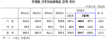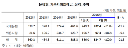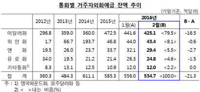 한국은행이 10일 발표한 2016년 1월 말 거주자 외화예금 현황에 따르면 외국환은행의 거주자 외화예금 잔액은 지난달 말 535억달러로 전월보다 21억3000만달러 감소했다.