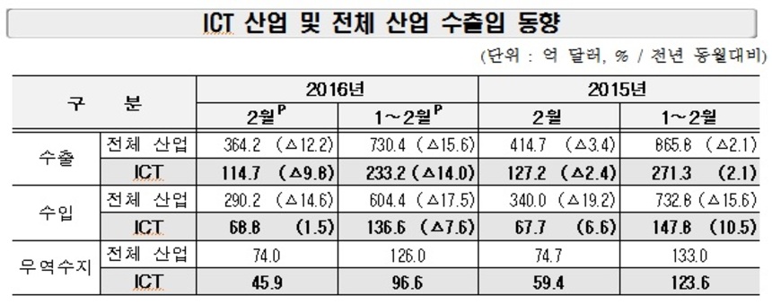 ICT 수지는 반도체, 휴대폰, 디스플레이 등 주력품목 흑자로 45억9000만달러 흑자를 기록했다. 전체 수지(74억달러) 흑자달성을 견인했다.