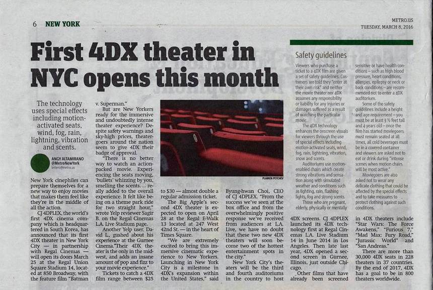 뉴욕 일간지 뉴욕 포스트도 맨해튼에 들어서는 첫번째 4DX 상영관 소식을 전했다. 이 신문은 “4DX의 환경 효과와 모션 체어를 통해 영화 팬들은 극장 안에서 완벽한 몰입감을 갖게 됐다”며 “이를 실현시킨 것은 한국 기업 CJ 4DPLEX”라고 소개했다.
