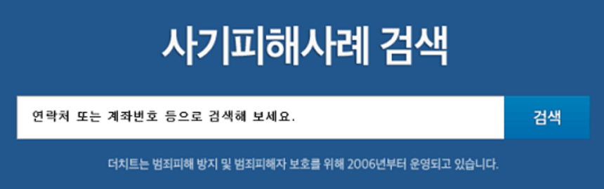 415, 95만2935, 20만3356,3157. 더치트 홈페이지 첫 화면에 뜬 숫자다. 각각 오늘 사기 예방수, 누적 사기 예방수, 전체 피해 사례수, 피해 발생 사이트 수를 나타낸다. 홈페이지 하단에 나와 있는 오늘 사기 예방수는 계속 올라가고 있다.