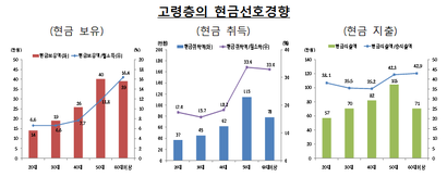 가구주가 50대와 60대 이상인 가계에서 현금 보유 규모가 두드러졌다. 가구주가 50대인 경우 40만원, 60대 이상은 39만원을 가지고 있는 것으로 조사됐다. 60대 이상 월 소득 대비 현금보유액 비중은 16.4%로 전체 연령층에서 가장 높았다.