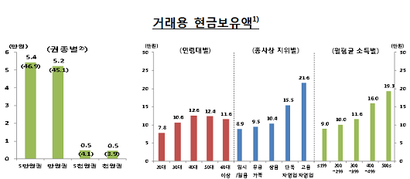 기업의 경우 100만원 미만 현금을 보유하고 있는 기업이 76.6%나 되고 1000만원 이상 보유 기업은 3.2%에 불과했다. 1000만원 이상 현금을 보유한 기업을 업종별로 보면 음식, 숙박업이 58.1%로 가장 큰 비중을 차지했고 도소매업은 16.1%, 운수업은 12.9%를 기록했다.