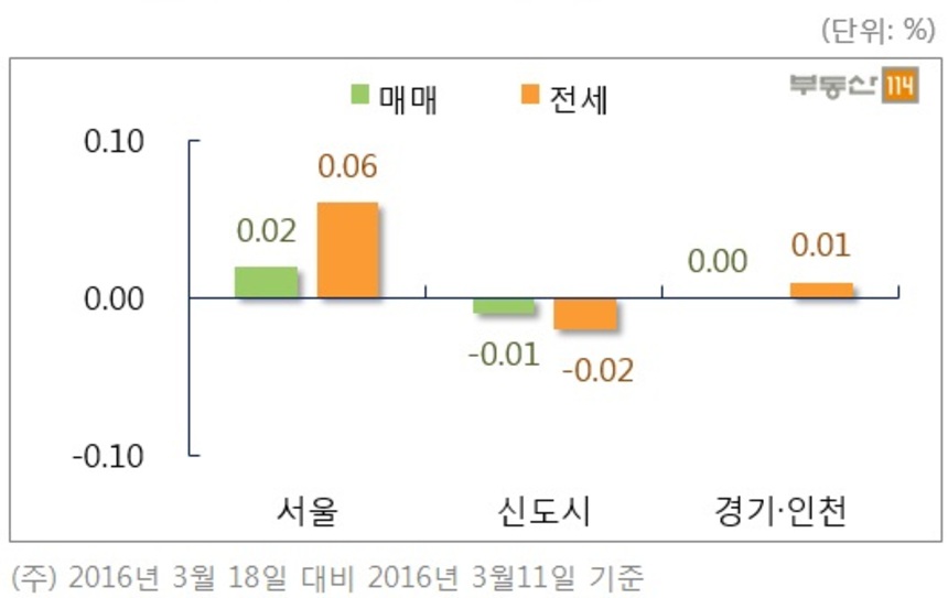 18일 부동산 114에 따르면 서울 아파트 평균 매매 가격은 3월초에서 3주차까지 0.05% 상승했다. 2014년(0.2%)과 2015년(0.53%) 동기 대비 오름폭이 둔화됐다.