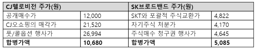 2015년 3월 SK텔레콤과 포괄적 주식교환이 결정됐을 당시 SK브로드밴드 기준주가는 4822원을 기록했다. 이후 자사 주식 처분가는 4170원, 주식매수청구권 행사 시 4645원을 각각 나타냈다. 하지만 SK브로드밴드의 최종 합병가액은 이보다 높은 5085원을 기록했다. 반면 CJ헬로비전 합병가액은 기존가치보다 가장 낮은 수주의 합병가액을 산정했다.