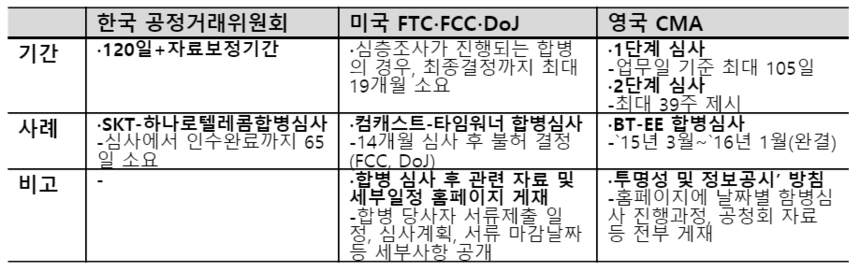 KT와 LG유플러스는 충분한 심사 시간을 가질 것을 주문했다. 해외 규제기간은 최장 19개월 심사한다. 소비자 편익과 시장에 미치는 영향을 면밀하게 분석하기 위해서다.