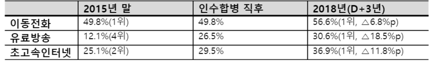 결합상품 가입추세와 전환율을 추정해 시장을 전망한 결과에서도 SK가 2018년 이동통신 점유율 56.1%, 초고속인터넷 점유율 36.9%, 유료방송 점유율 30.6%로 모두 1위를 차지한다. 특히 이동통신 분야에선 SK텔레콤이 경제협력개발기구(OECD) 회원국 34개 국가 중 가장 높은 점유율을 차지한다. 2개 사업자만 경쟁하는 국가는 예외다. 를 조사 대상에 뺐다.
