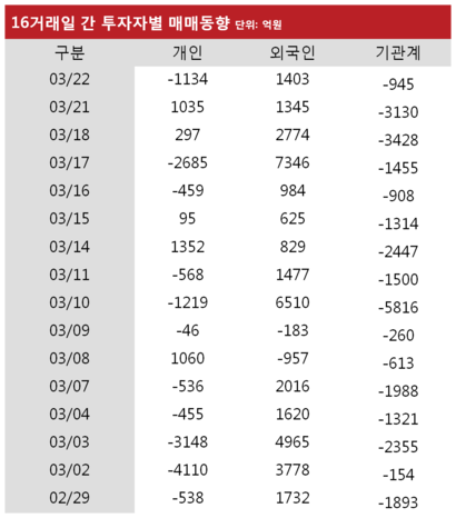 한편 기관은 또 연속 순매도 기간 동안 대형주 위주로 매물을 내놓았다. 기관은 16거래일 동안 삼성전자에서는 5801억3000만원을 매도했다. SK하이닉스에서 2213억7900만원을, 삼성물산에서 2156억6400만원을 팔았다.