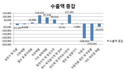 반면 수출량이 가장 크게 증가하는 3대 산업은 기초 화학제품(0.41%), 제1차 금속제품(0.39%), 석유제품(0.36%)이었다.