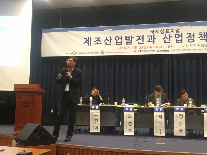 조 교수는 정부의 환율 및 단가인하 정책과 대기업의 소수 수출 품목에 대한 과도한 의존 등이 제조업의 위기를 불렀다고 진단했다. 이어 그는 “한국 제조업을 위기로 내몬 정부가 오히려 대기업 위주의 정책을 펴 제조업 노동자들을 벼랑으로 내몰고 있다”며 정부의 기업활력제고특별법(원샷법)을 비판했다.