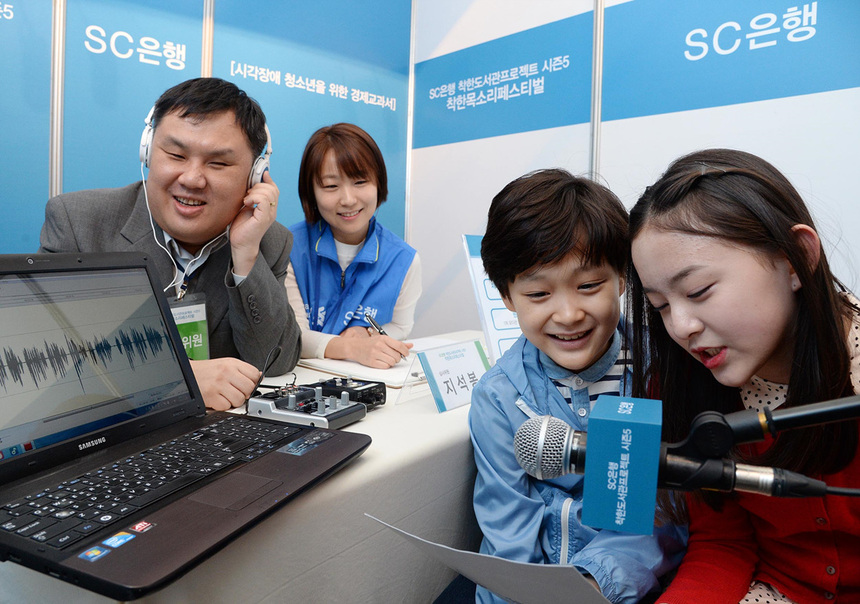 한편, 한국SC은행은 ‘착한도서관프로젝트’를 2011년부터 매년 진행 중이다. 이를 통해 일반인의 목소리 기부 캠페인을 펼치며, 시각장애인을 위한 여행책, 영화, 미술작품, 서울시 문화재 묘사 관련 900건의 오디오 디지털 콘텐츠를 제작했다. 또 총 2만1,400부의 오디오북, 점자책, 무료 스마트폰 앱, 시각장애인을 위한 GPS가이드 등을 제작해 전국 맹학교와 시각장애인유관단체 등에 기부해오고 있다.