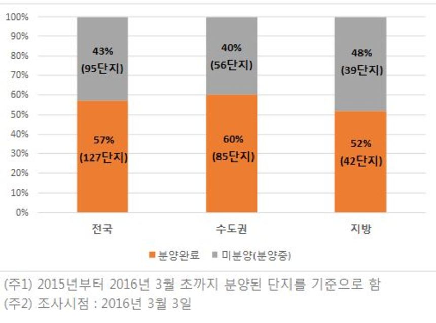 수도권은 141단지 중 56개로 미분양율이 40%였다. 지방은 81단지 중 39개 단지(48%)로 조사됐다.