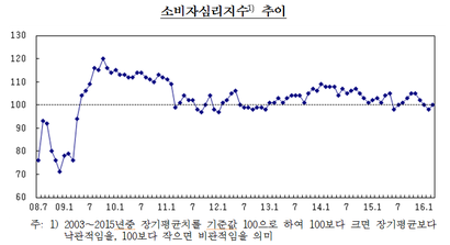 소비자심리지수는 소비자들의 경제상황에 대한 심리를 종합적으로 나타내는 지표다. 현재 생활형편, 생활형편전망, 가계수입전망, 소비지출전망, 현재경기판단, 향후경기전망을 포함한 6개 부문 지수 조사로 산출된다. 장기평균치(2003년~2015년12월)를 기준값 100으로 이보다 크면 낙관적, 낮으면 비관적임을 의미한다. 이번 조사는 지난 13~21일까지 전국 도시 2200가구(응답(2065가구)를 대상으로 진행됐다.