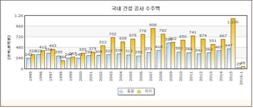 이는 민간수주 증가세에서 비롯된 면이 크다. 지난해 69.7% 성장해(2014년 대비) 113.2조원을 기록했다. 민간 주택 수주가 74.5% 증가해 전체 증가액을 이끌었다.