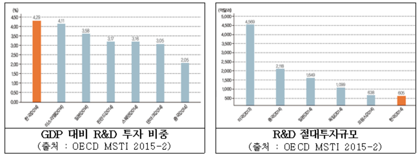 2014년 한국 R&D 투자 금액은 605억 달러로 GDP 대비 비중이 4.29%였다. 그러나 한국이 GDP 2% 규모를 R&D에 투자한 시기는 94년부터였다. 미국, 일본 등 선진국은 1970년대부터 GDP 대비 2% 이상을 R&D에 투입해 누적액에서 한국과 큰 격차를 보였다. 1981년부터 2013년까지 32년간 R&D투자액은 한국을 1로 봤을 때 미국이 15.4, 일본은 7.4로 나타났다.