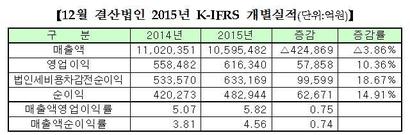31일 한국거래소에 따르면 유가증권시장 상장 12월 결산법인 636사의 2015사업연도 실적을 종합한 결과, 개별 재무제표 기준 이들 기업의 지난해 영업이익은 61조6340조, 당기순이익은 48조2944억원을 기록했다. 전년과 비교해 각각 10.36%, 14.91% 증가했다. 그러나 매출액은 1059조5482억원으로 전년 대비 3.86% 감소했다.