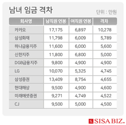 ▲LG 4745만원 ▲CJ 4500만원 ▲S-Oil 4349만원 ▲SK하이닉스 3725만원 ▲현대모비스 3560만원 ▲현대건설 3540만원 ▲삼성전자 3500만원 순으로 남녀간 임금 차이가 났다. .