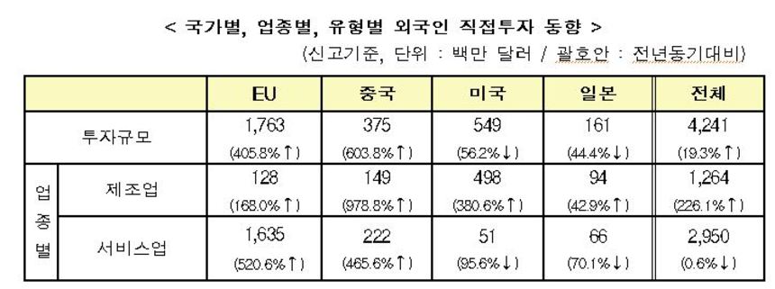 EU·중국서 투자 급증…제조부문 늘고 서비스 소폭 줄어