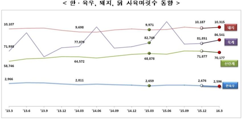 통계청이 8일 발표한 ‘2016년 1분기 가축동향조사’에 따르면, 올해 1분기 축산농가의 한·육우 사육 마릿수는 259만6000마리로 지난해 같은 기간보다 6만3000마리(-2.4%) 줄었다. 전분기와 비교해서도 8만1000마리(-3.0%) 감소했다.