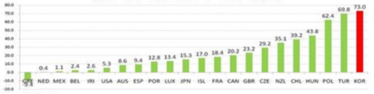 한국의 임금 10분위수 배율은 4.70을 기록하며 비교 회원국 21국 중 3위를 차지했다. 미국(5.08), 칠레(4.72)가 1,2위를 차지했다. 임금 10분위수는 임금분포를 10분위로 나눠 최하위층 소득 대비 최상위층 소득 배율을 나타내는 값이다.